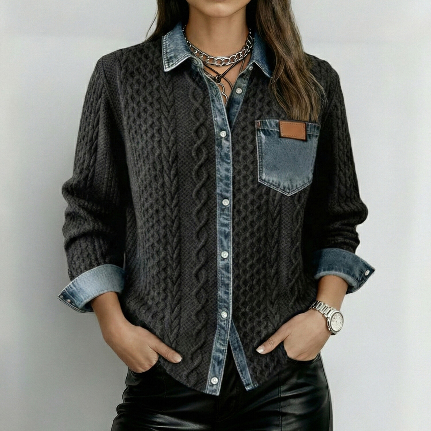 Women's Cable Knit Patchwork Denim Shirt Collar Long Sleeve Button Chest Pocket Blouse