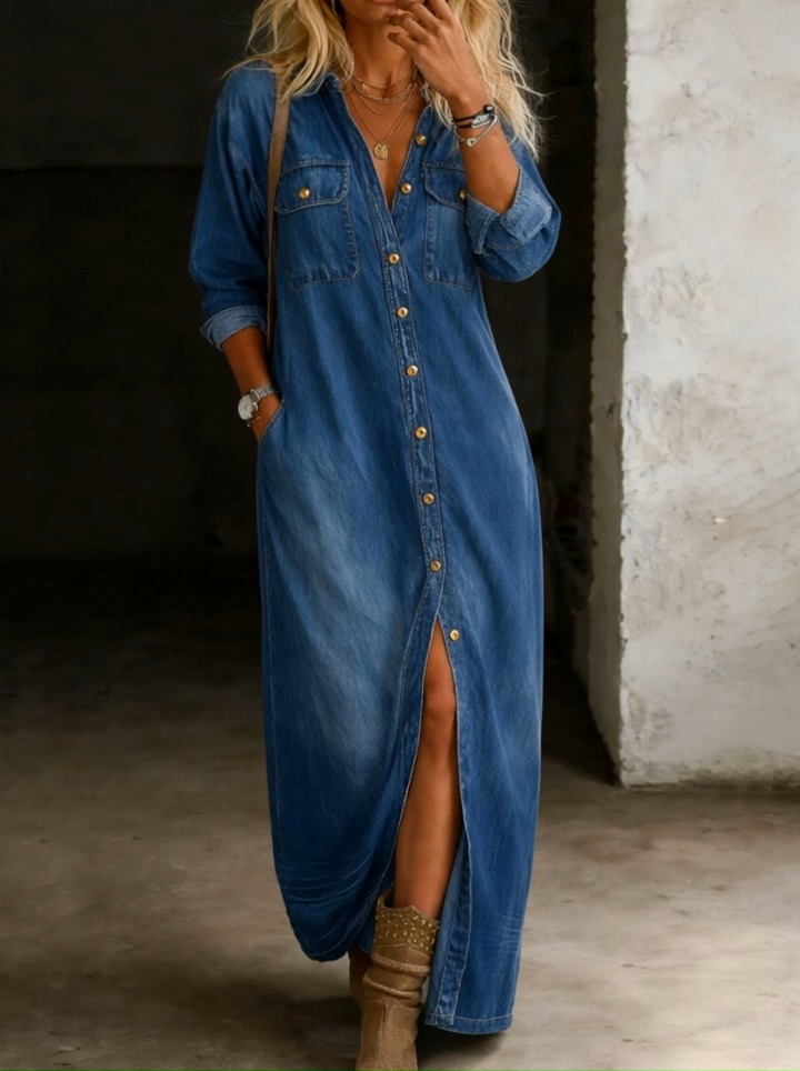 Womens Casual Fashion Blue Denim Shirt Midi Dress