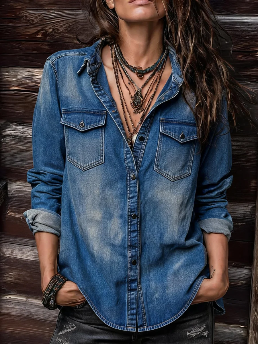 Women's Casual Long-Sleeved Washed Cotton Denim Shirt