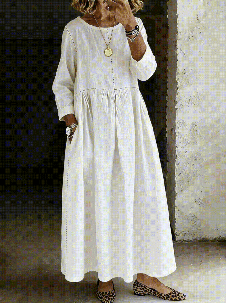 Women's Solid Color Round Neck Long-sleeved Casual Loose Cotton and Linen Dress